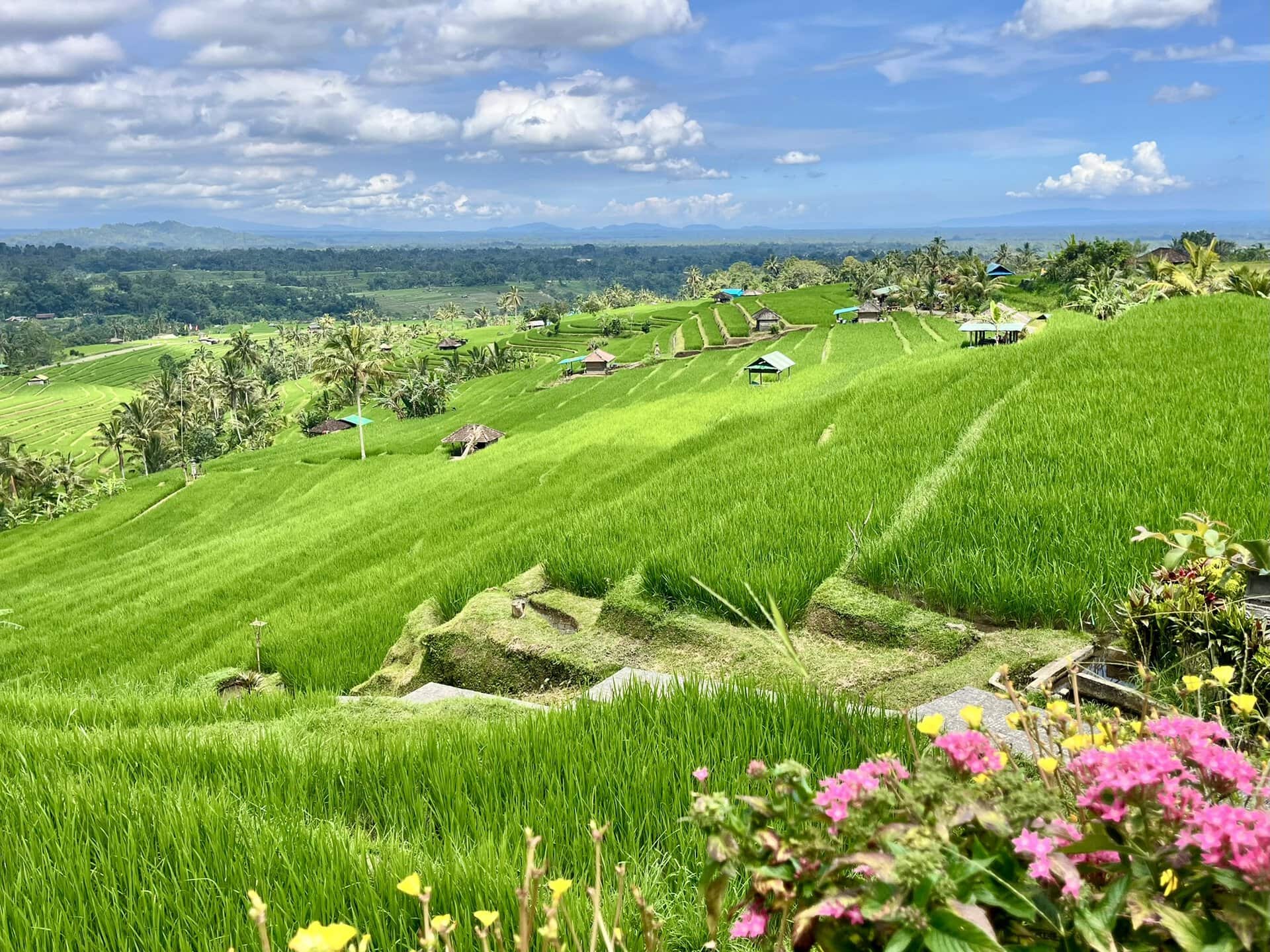 Im Anschluss an dieses Event geht unsere Fahrt weiter, Richtung Berge. Wir halten am Jatiluwih-Aussichtspunkt. Der Instagram-Hingucker auf die Reisfelder. Auch wenn das sicherlich ein Touristenmagnet ist, ist ein Foto hier tatsächlich eine Wucht. Und wir erleben es bei guter Sonneneinstrahlung. Jatiluwih ist UNESCO-Weltkulturerbe.